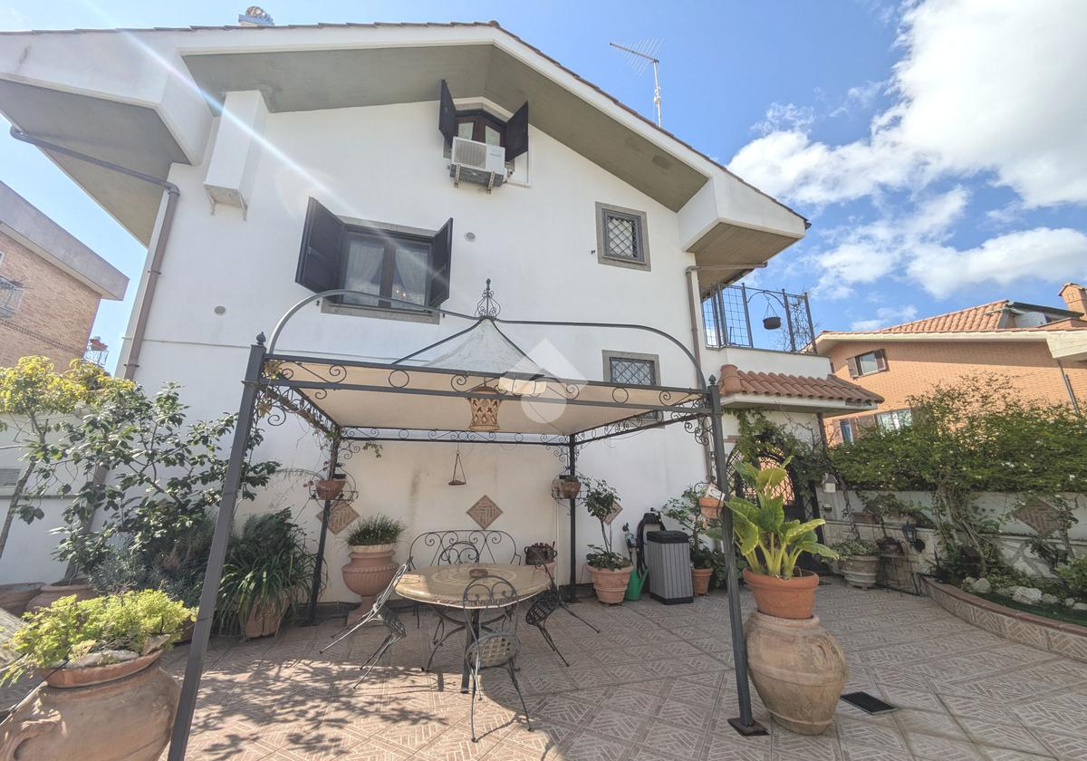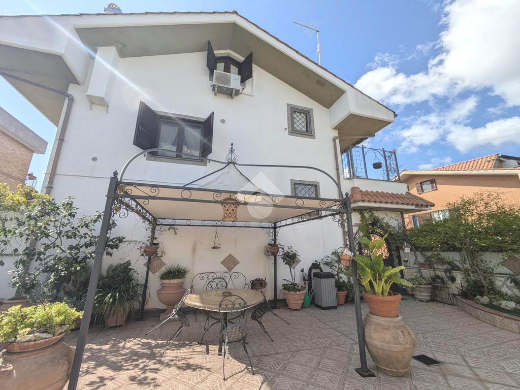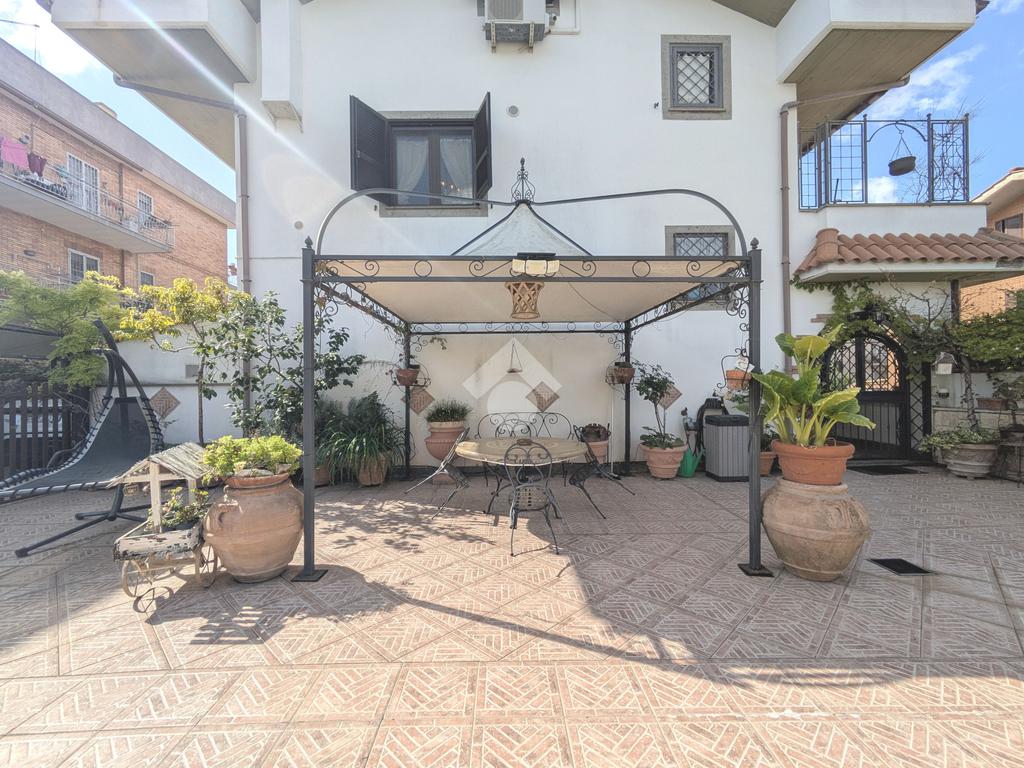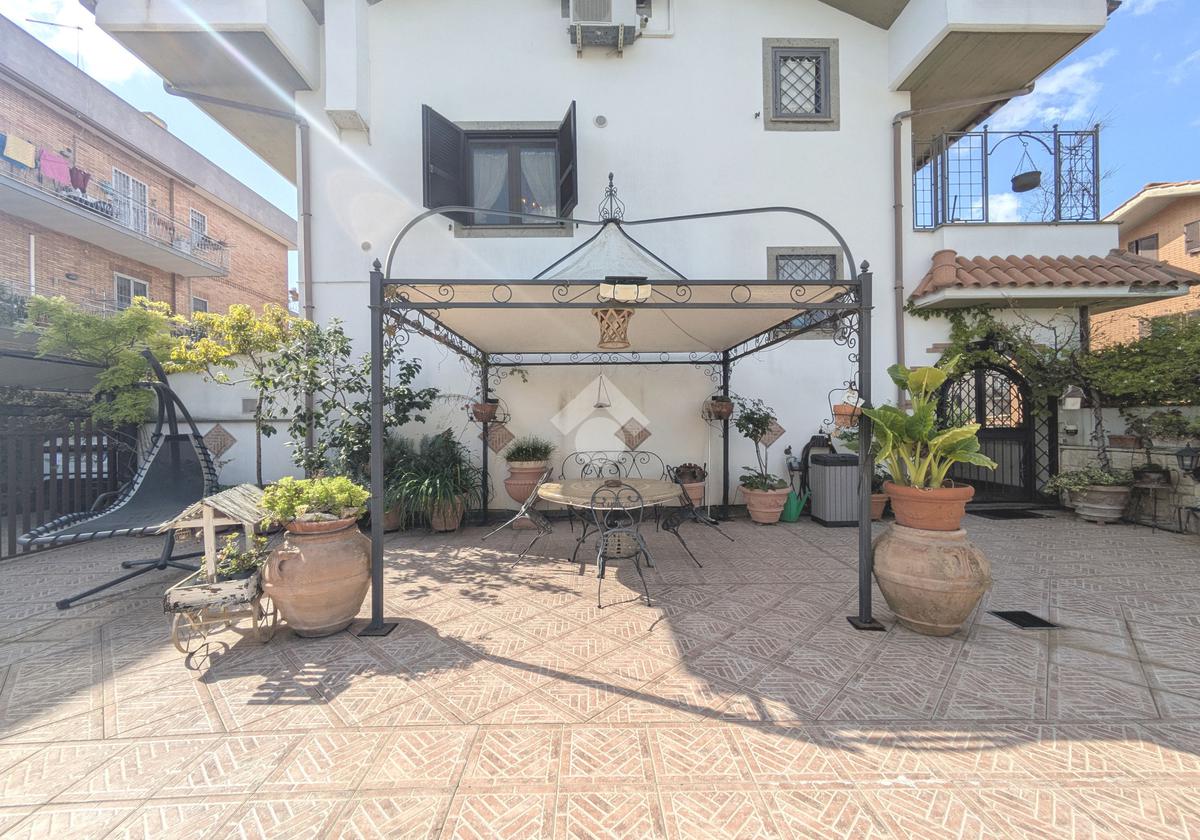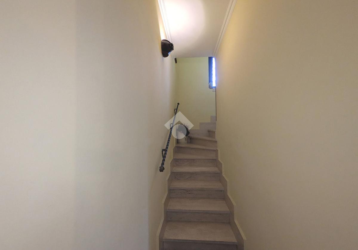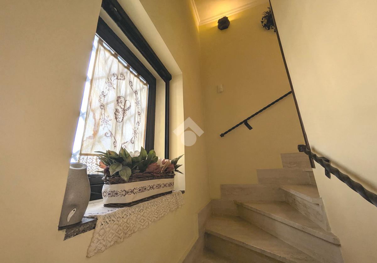 L'accesso alla proprietà avviene attraverso un parcheggio privato interno, comodo anche per due vetture grandi, da cui dopo aver parcheggiato possiamo entrare all'interno nel giardino. Il giardino che ci accoglie è principalmente mattonato ma con delle aiule verdi molto curate. Questo spazio è la vera perla della casa, uno spazio all'aperto dove trascorrere le belle giornate in compagnia degli amici e della famiglia, tra barbecue e tavolate. Per le giornate più fredde è stato creato un portico a vetri dove intrattenersi con un salottino di rappresentanza o eventualmente dove creare uno studio. E per gli amanti del bricolage è presente una casetta in legno dove poter riporre tutti gli attrezzi o dare libero sfogo alla creatività. Attraverso una scala in marmo saliamo al piano primo. Ad accoglierci è un salone molto luminoso grazie alla doppia esposizione. Il parquet, caldo ed elegante, fa da cornice a questo ambiente curato in ogni minimo dettaglio. Grazie alle due porte finestre, possiamo uscire sul terrazzo, perimetrale ed abitabile, dove poter mangiare all'aperto nella bella stagione. La cucina è un ambiente separato dove poter mangiare anche in 6 persone, arredato da una bellissima cucina in muratura dallo stile rustico, correlata di camino. La zona notte, che si trova al piano superiore dell'immobile, comprende una camera da letto con letto a baldacchino ed una cameretta. I due piani sono separati da una porta al fine di permettere il risparmio energetico e un miglior riscaldamento/raffrescamento dei singoli ambienti. I servizi, che si trovano sia al piano primo che al piano superiore, offrono praticità e comfort per la vita quotidiana e sono arredati di lavabi su misura: uno ha la vasca e l'altro ha la doccia. Il fabbricato di cui fa parte è stato costruito nel 1987, ma l'appartamento internamente è stato ristrutturato totalmente dall'attuale proprietario, che non ha risparmiato ne sulla qualità dei materiali ne sui dettagli. E' dotato di aria condizionata, persiane blindate, zanzariere, antifurto e tende da sole. La casa viene venduta con l'arredamento incluso di: cucina, bagni, armadi su misura, letto a baldacchino e casetta di legno in giardino.
