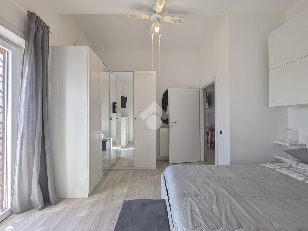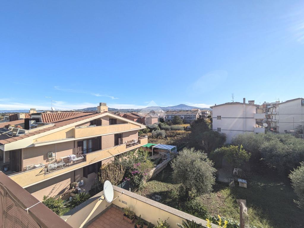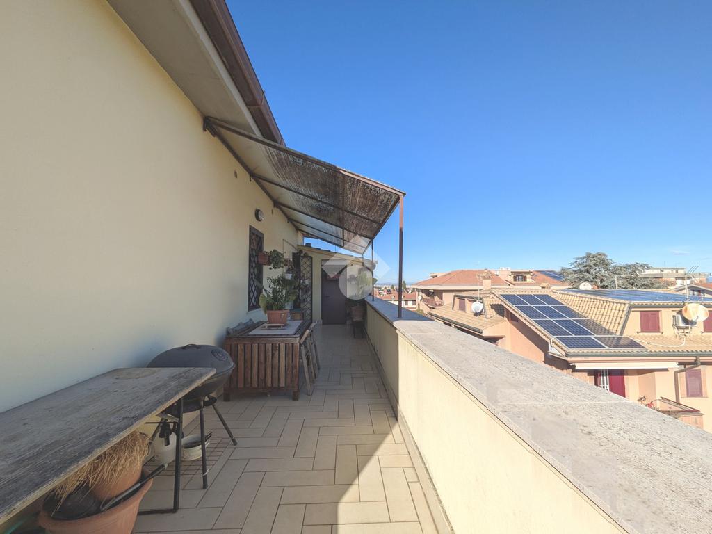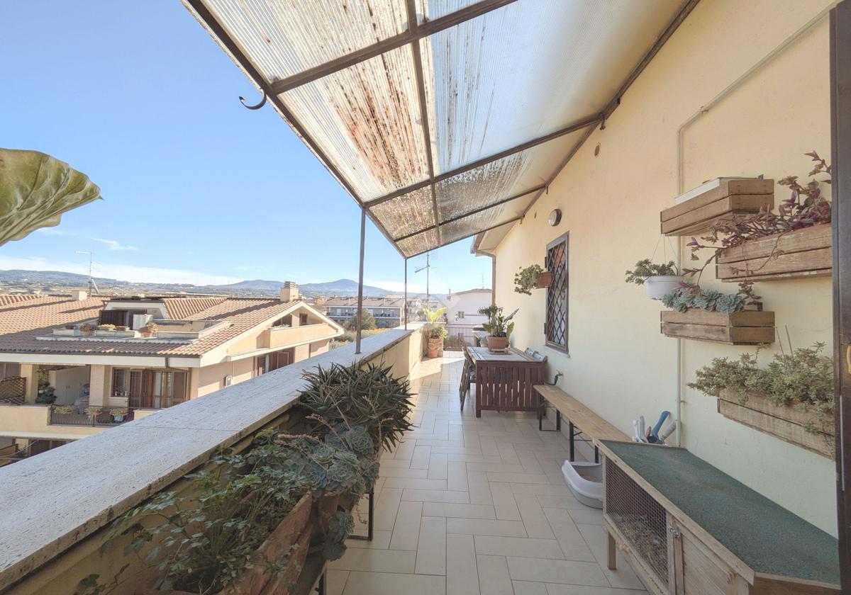 In via A. Olearo, una traversa di via Milano, vicino alla chiesa, le attività commerciali, la stazione dell'Acqua Acetosa e le scuole, proponiamo in vendita un appartamento posto al piano attico, secondo ed ultimo piano di una piccola palazzina in pittura composta da soli 7 appartamenti, senza ascensore e senza condominio. La soluzione è divisa in ingresso, salone, cucina abitabile, 2 camere matrimoniali, bagno. La caratteristica principale di questa casa è la luminosità: ha infatti tripla esposizione (EST - SUD e OVEST) e ogni lato della casa è servito ed ha affaccio e/o uscita su uno spazio esterno. Dalla cucina si accede al terrazzo, abitabile, per mangiare e vivere i momenti di convivialità all'aperto guardando lo splendido panorama che i castelli romani offrono. Il terrazzo prosegue poi nella zona della camera da letto come balcone. Sempre sul terrazzo troviamo un comodo ripostiglio adibito a lavanderia, vano caldaia e deposito. Dal soggiorno invece e dall'altra camera, è possibile uscire su un secondo balcone. Internamente si presenta in buone condizioni, ristrutturato circa 15 anni fa. Gli infissi sono in PVC con i doppi vetri e le finestre sono dotate di cancelletti anti intrusione ed avvolgibili. L'immobile viene venduto con la mobilia presente all'interno di cucina, soggiorno, bagno e cameretta. Ideale quindi per chi cerca immobili da affittare vista la vicinanza con la stazione del treno piuttosto che una casa già pronta per andare ad abitare ammortizzando i costi iniziali. Termoautonomo, l'immobile è dotato di climatizzatori. Completa la proprietà al piano terra con cancello carrabile, un ampia area di proprietà esclusiva da adibire a parcheggio sia di più auto e moto oltre che di Camper vista la dimensione e la comodità d'accesso.
