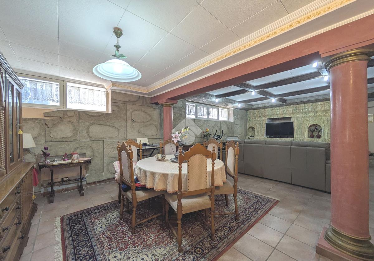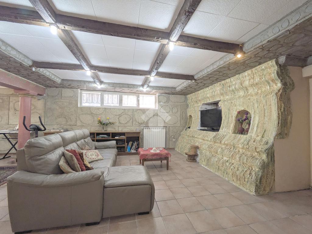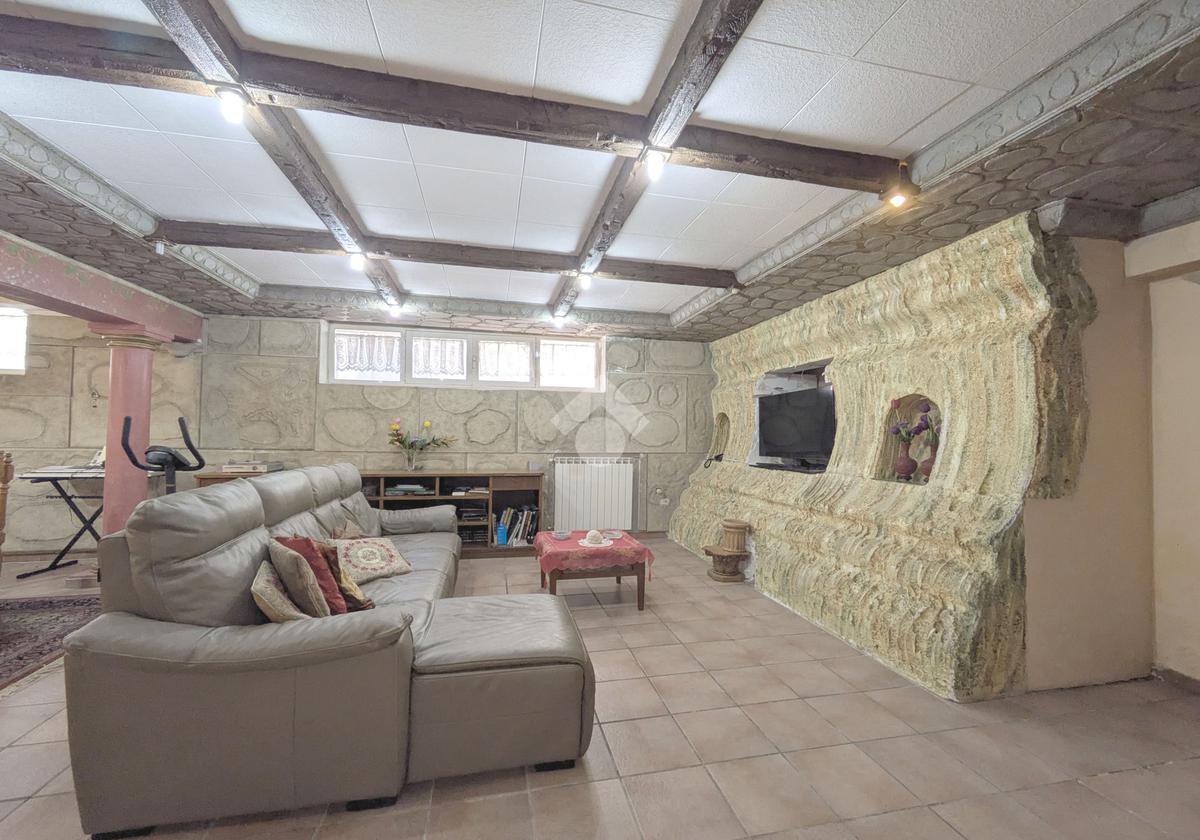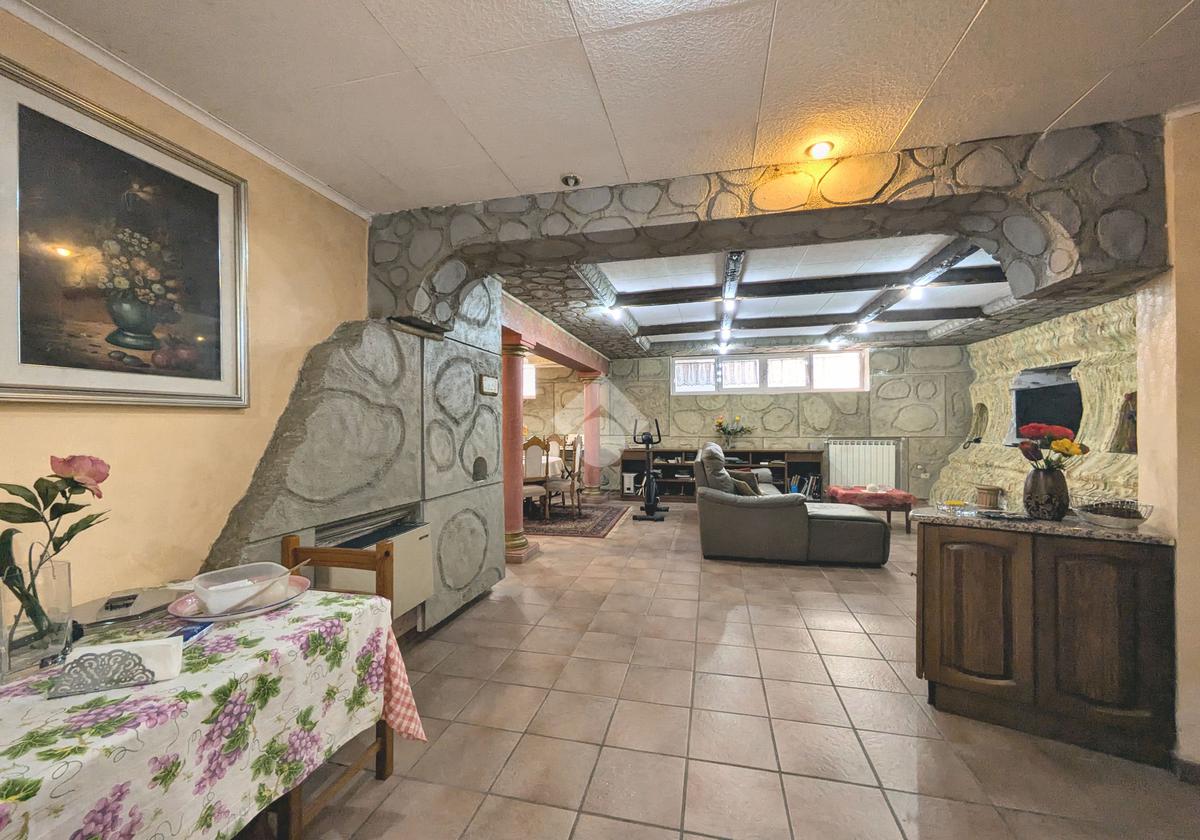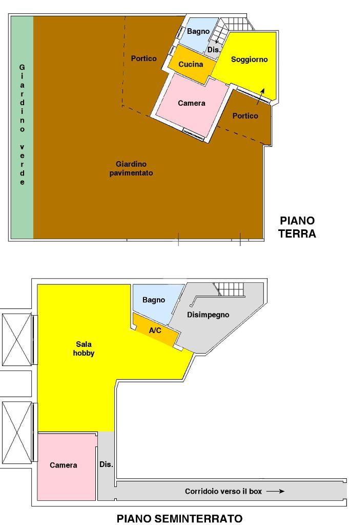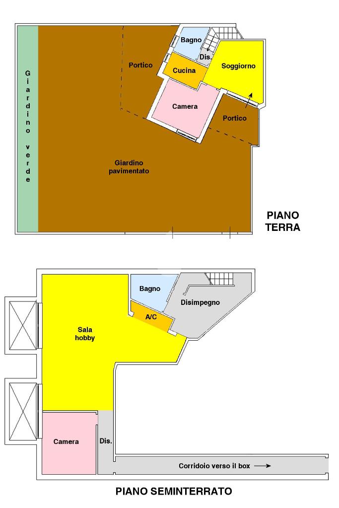 Si accede attraverso un cancello automatico che consente l'entrata sia pedonale che carrabile per più veicoli all'interno del giardino di proprietà. Questa area, prettamente pavimentata, è un ampio giardino di 180 mq, molto soleggiato perché gode di un ottima esposizione (sud- est); da qui si entra all'interno dell'appartamento dove ci accoglie un primo salottino, una camera da letto, un bagno ed un cucinotto. Attraverso una scala in muratura, si accede al piano seminterrato di 80, la sala hobby: qui un comodo disimpegno ci introduce ad un grande soggiorno con angolo cottura, una camera da letto matrimoniale e un secondo bagno.